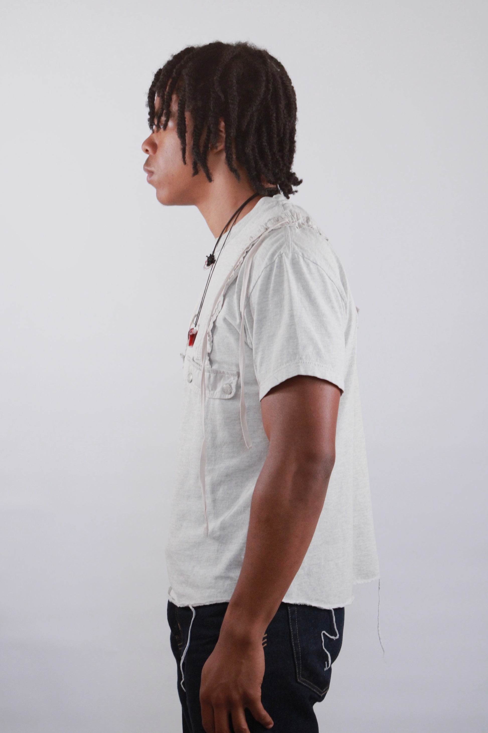 White-grey t-shirt with cargo straps stitched onto the front and back, with strings hanging from the shirt