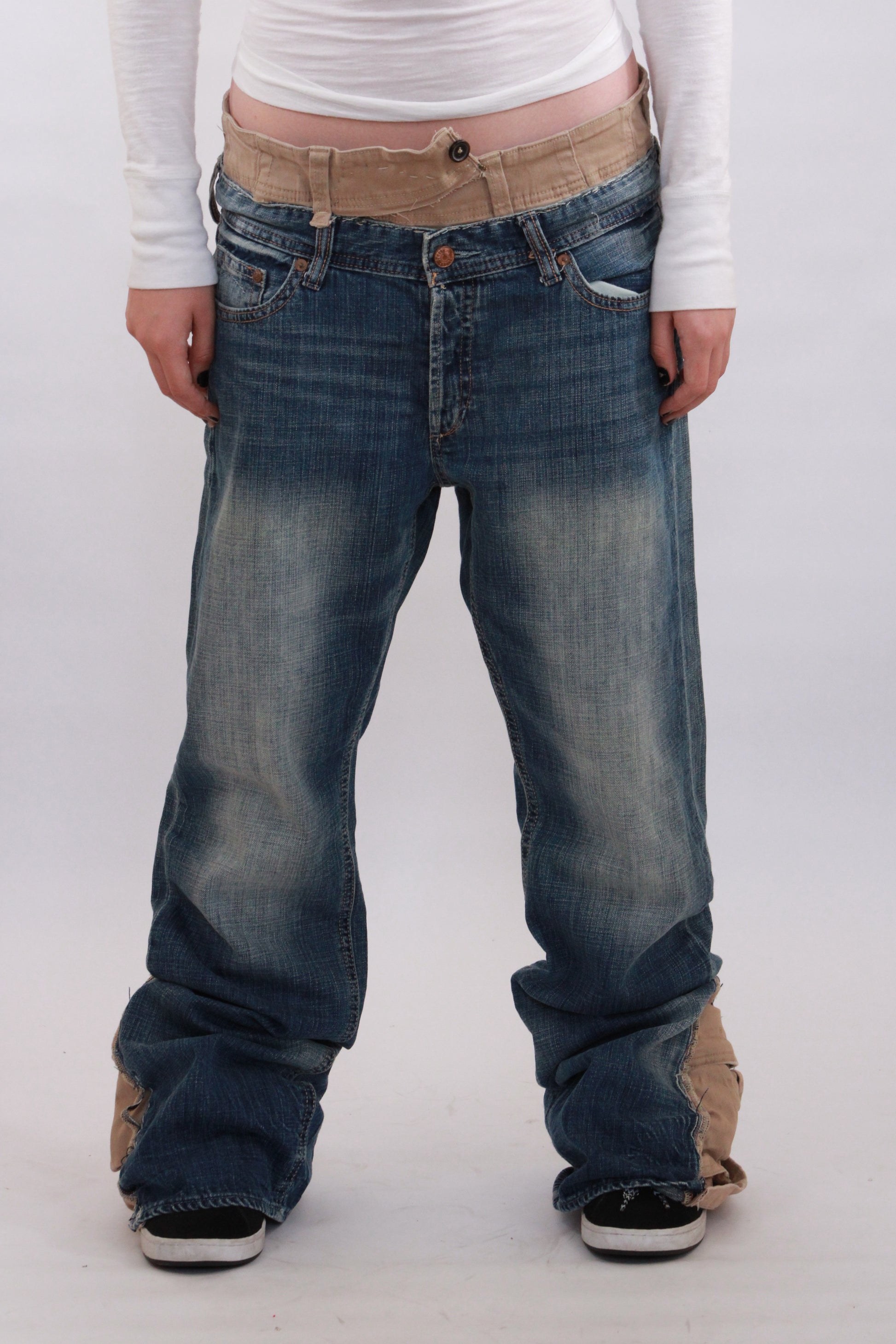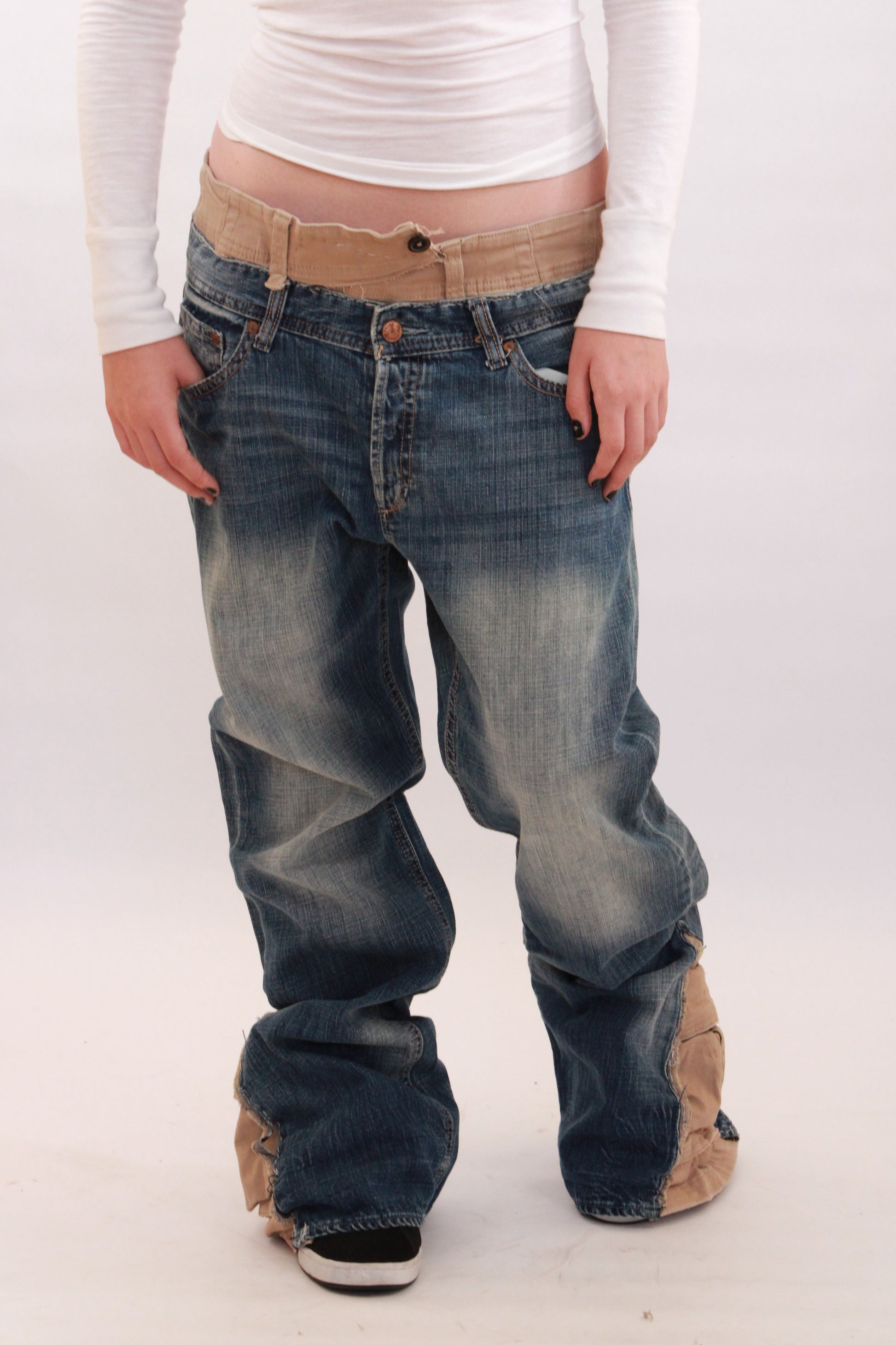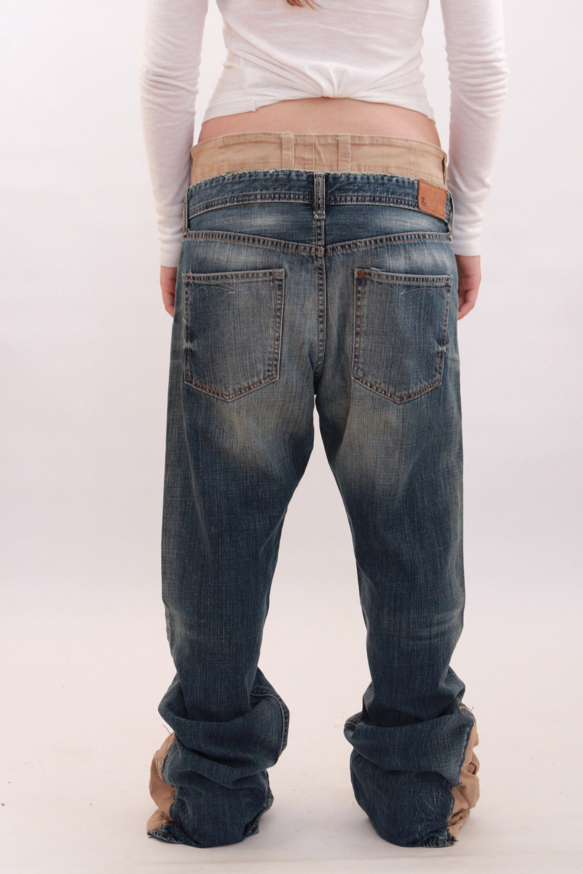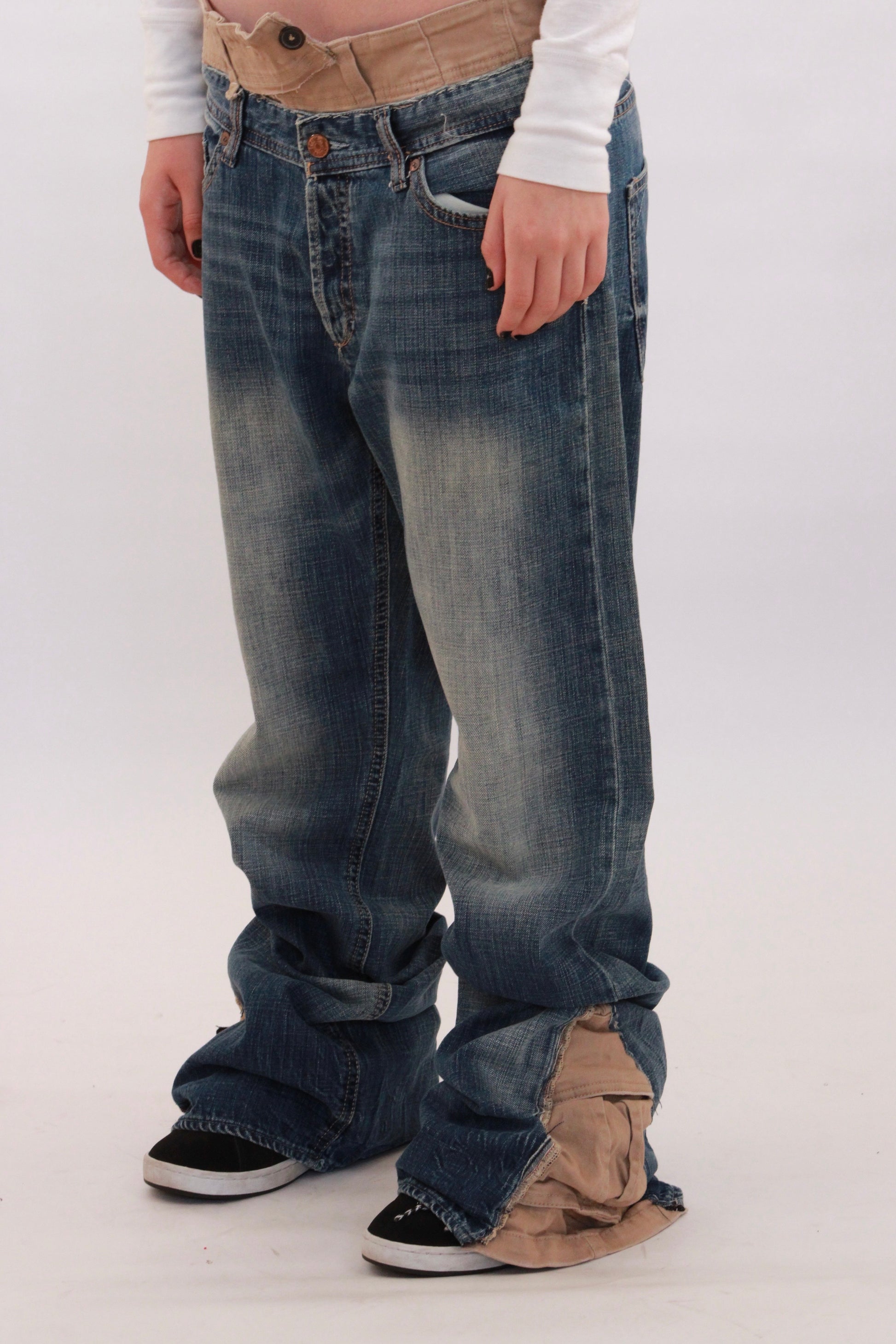 Dark blue washed denim pants with a tan cargo waistband for a double-layered look, featuring a triangle cut at the bottom filled in with tan cargo pockets.