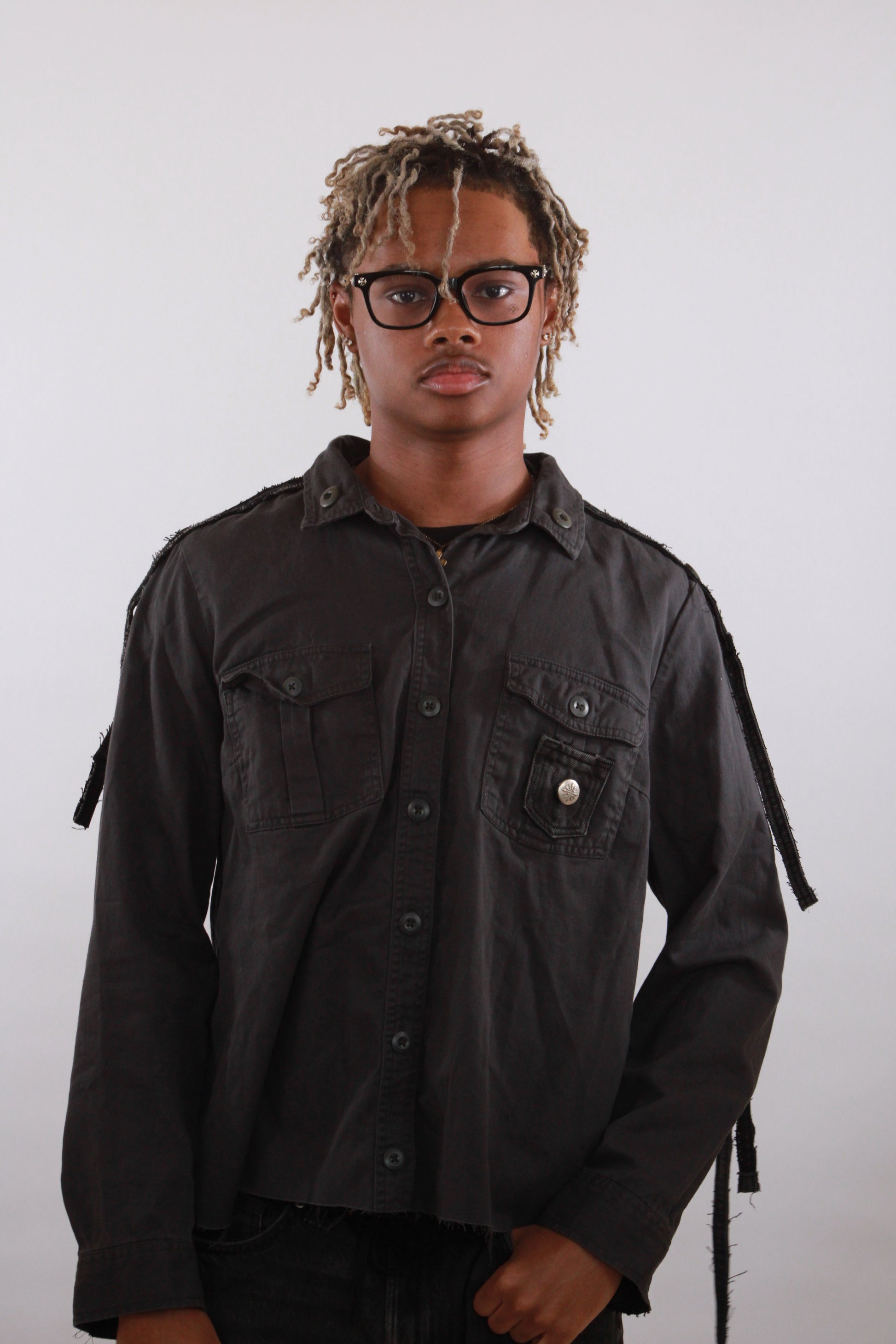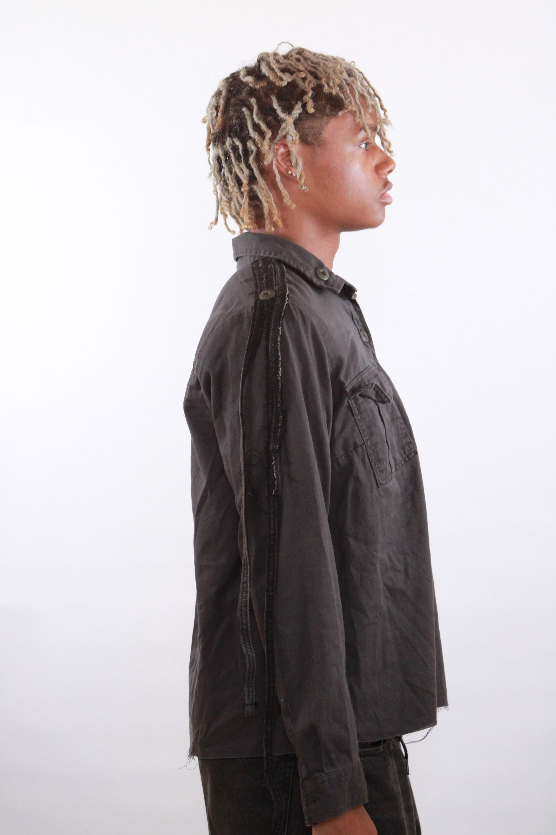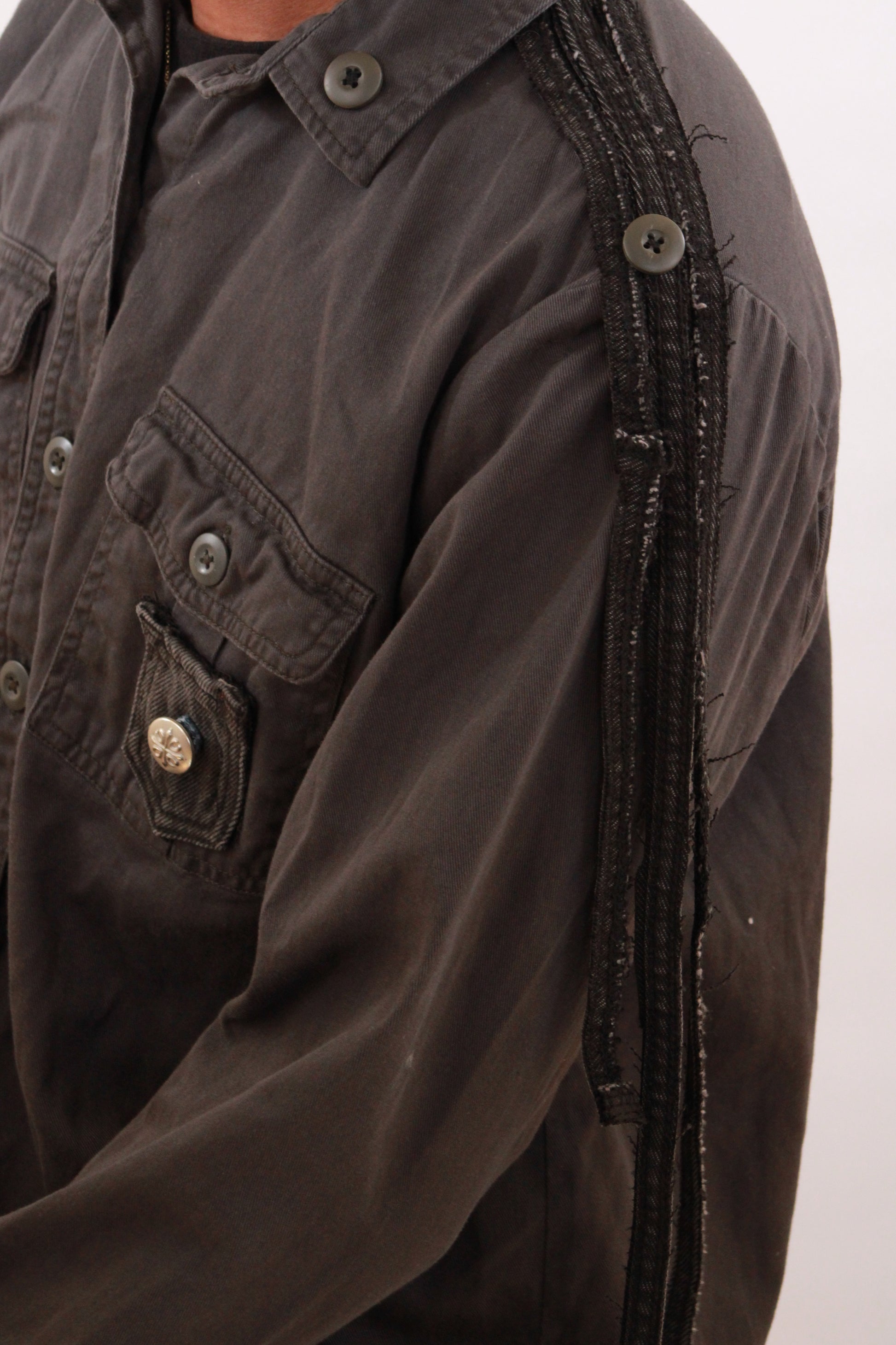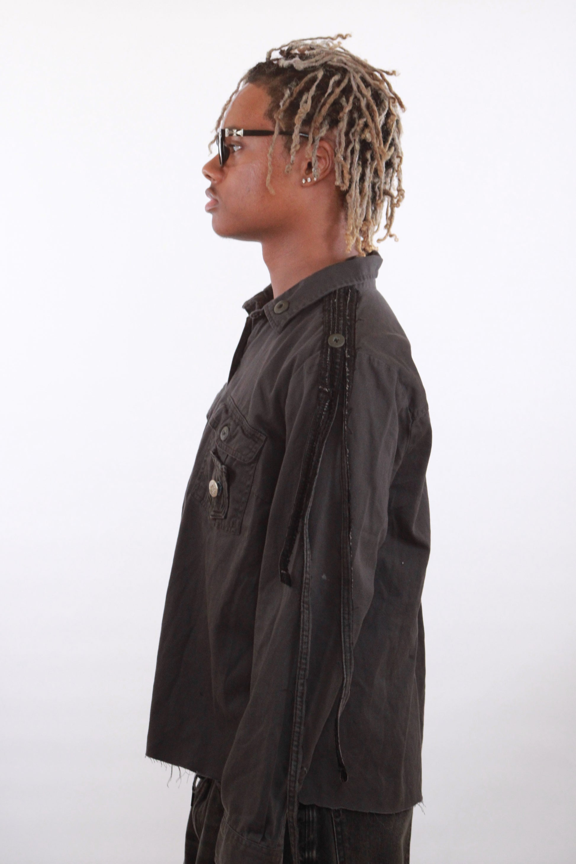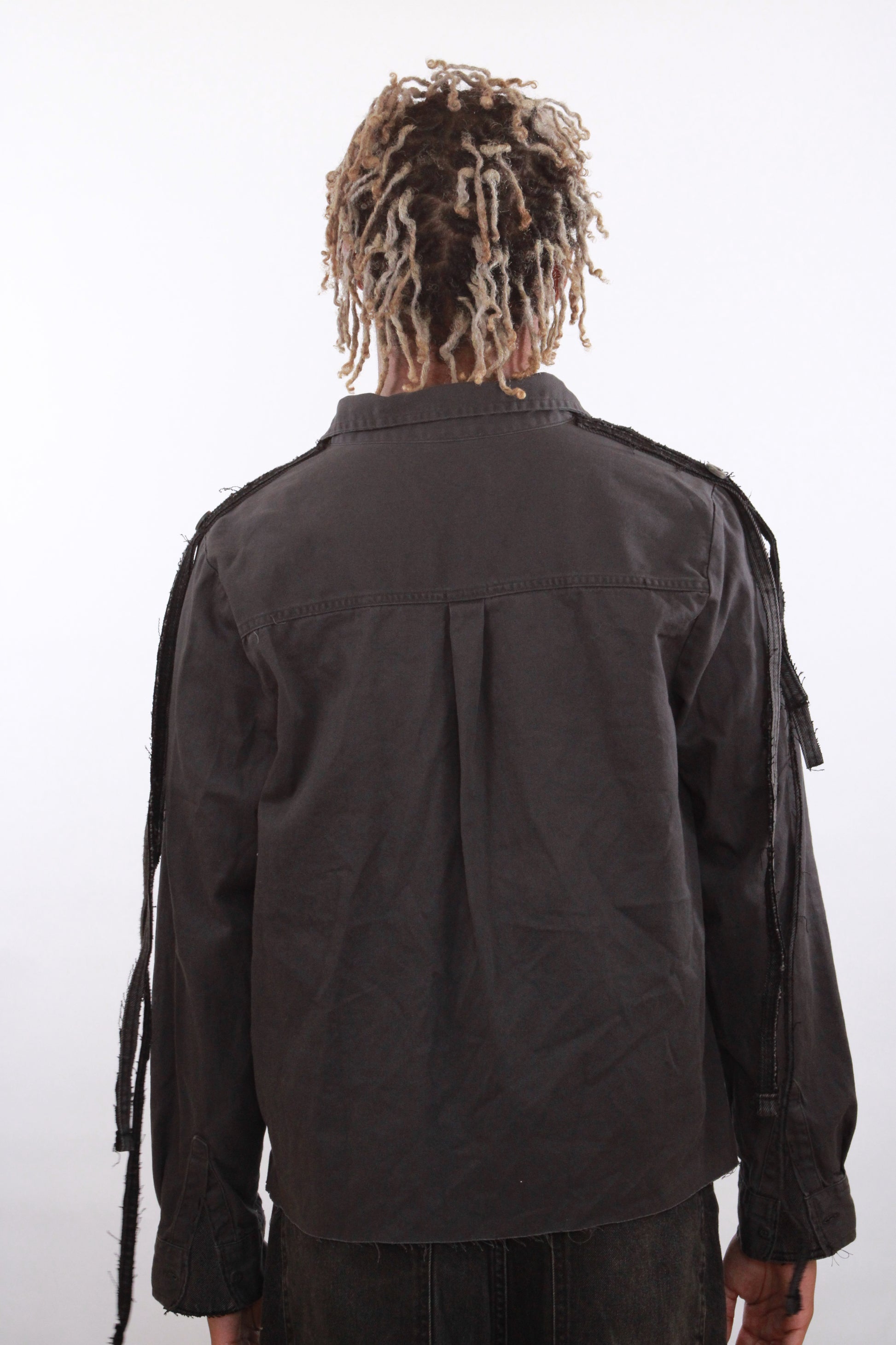 Dark grey long-sleeve button-up with denim straps hanging from both sides of the sleeves and buttons stitched in some areas with a mini denim pocket patched